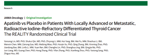 2021年12月16日,权威医学杂志《JAMA Oncology》(影响因子31.777)在线发表阿帕替尼的一项III期临床研究(REALITY)——甲磺酸阿帕替尼片治疗局部进展/转移性放射性碘难治性分化型甲状腺癌(RAIR-DTC)患者的多中心、随机、双盲、安慰剂对照临床研究。此研究由北京协和医院的林岩松教授和南京金陵医院的秦叔逵教授发起,在全国21个研究中心展开,由金年会金字招牌诚信至上医药中央医学事务部团队支持完成。